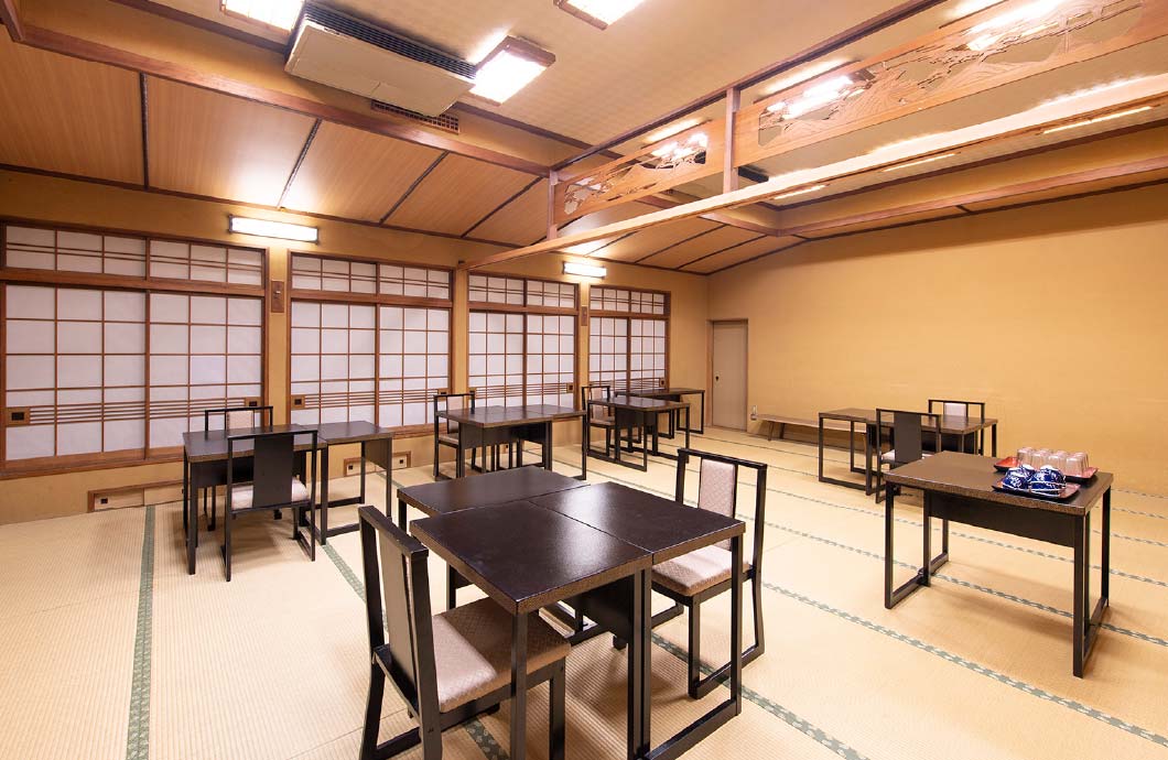 The dining room is equipped with tables and chairs. Guests with weaker legs or backs can also rest easy.