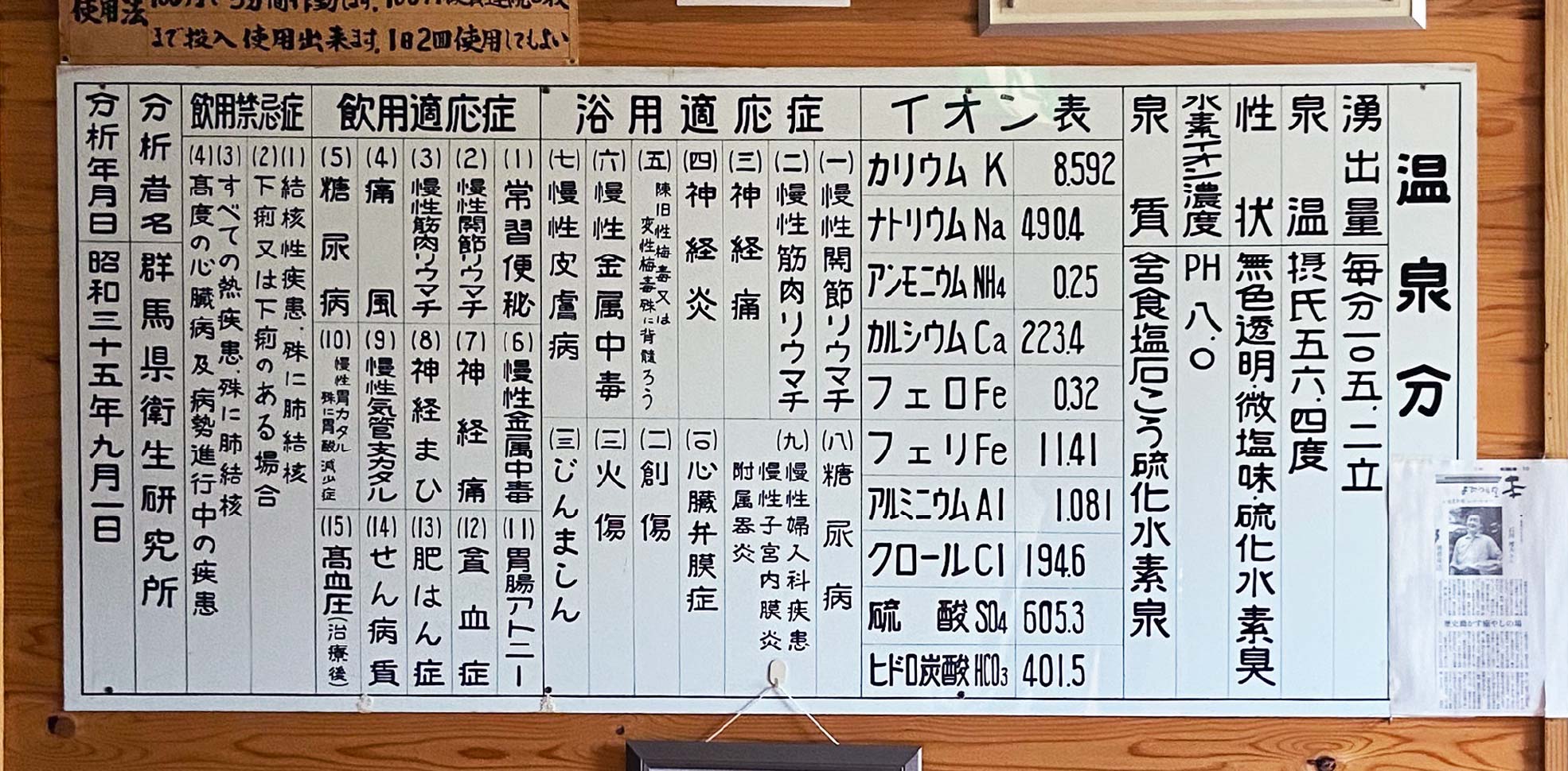 The hot spring ranking list published in 1873 in the Fuyuzuminosato Museum in the neighboring village of Kuni shows Kusatsu Onsen as the Ozeki of the east (there was no Yokozuna at that time, and the highest rank was Ozeki), with Sawatari Onsen in the center column of the list of promoters. Later, in 1945, the hot spring resort was destroyed by a large fire. With the construction of new roads and other changes in the times, the area has come to be known as a "hidden hot spring”.