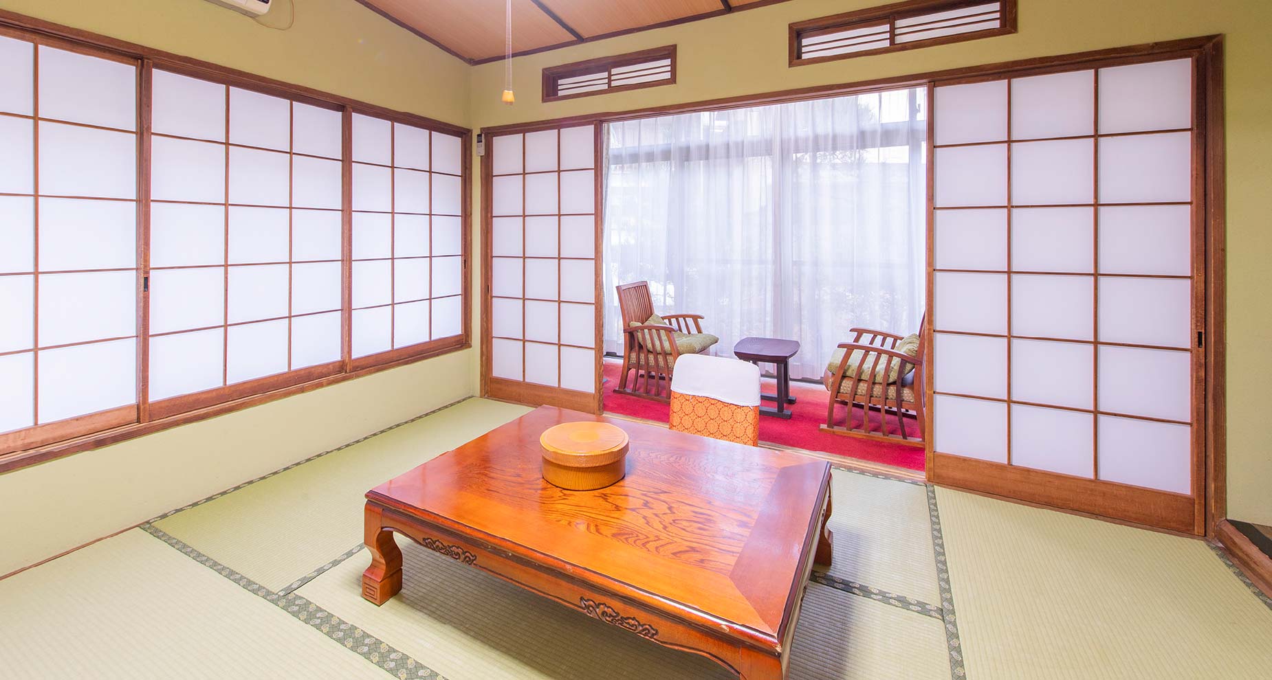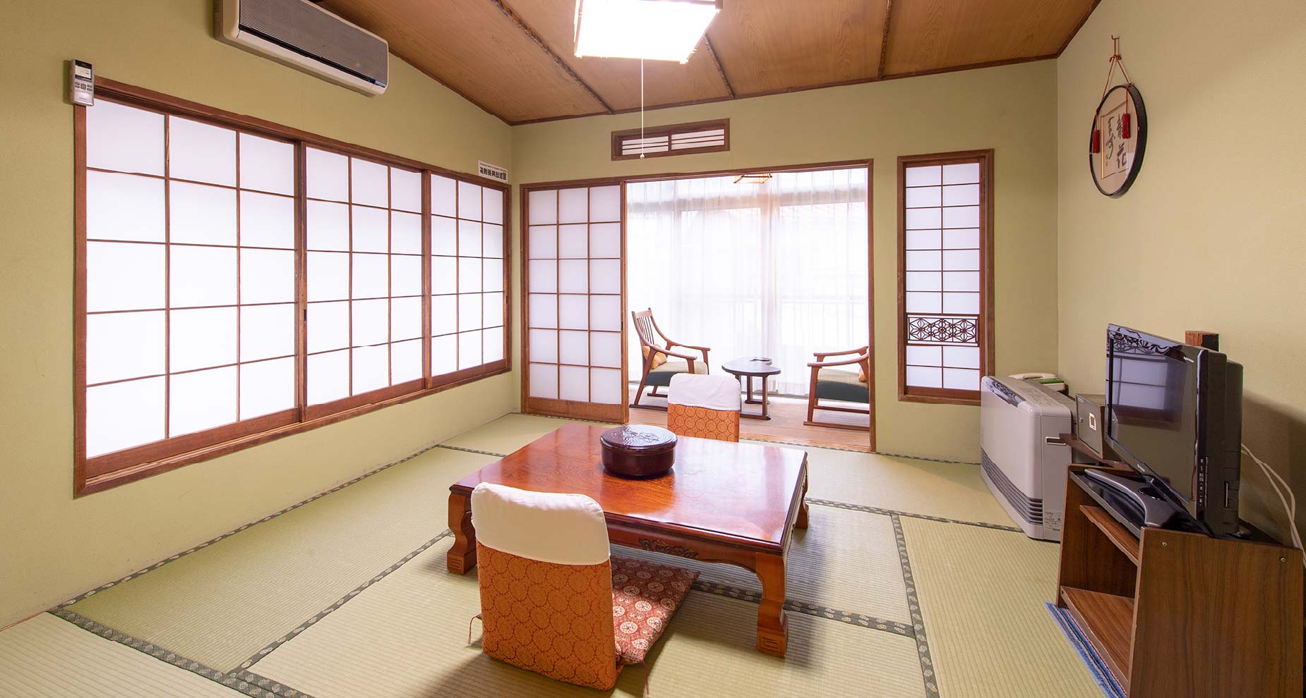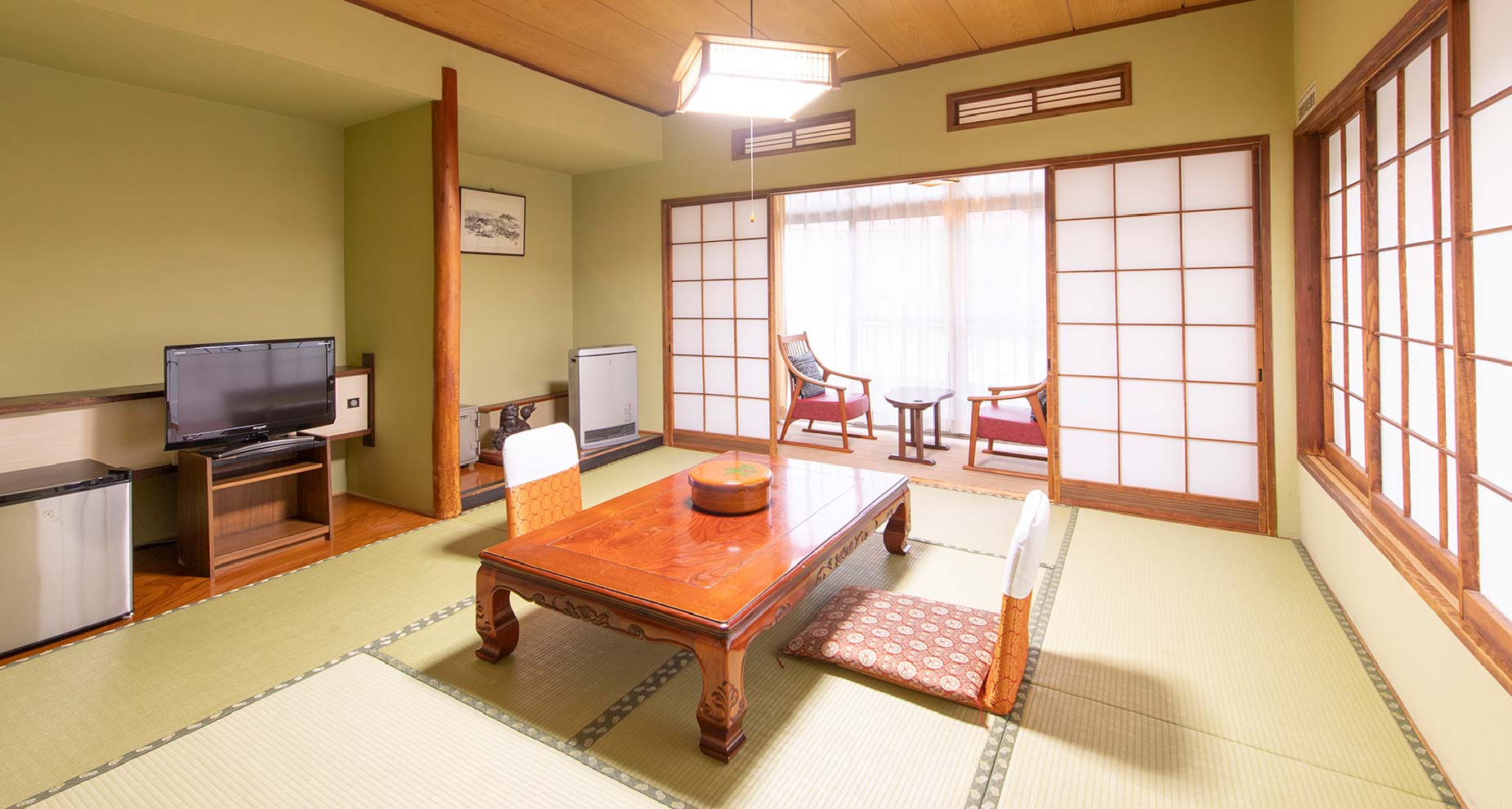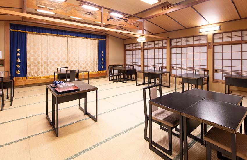 お食事処は、テーブルとイスをご用意しています。足や腰があまり良くないお客様もご安心ください。広間は宴会場としてもご利用いただけます。